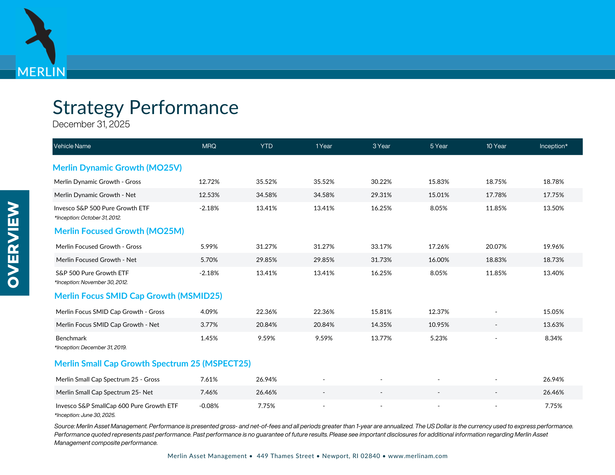 Merlin Dynamic Growth (MO25V) earned top-ten recognition for both the 1-Quarter and 1-Year periods in the Large Growth Universe. For the year ending December 31, 2025, MO25V returned 12.72% for the quarter and 34.58% net of fees for the year versus 13.41% for the Invesco S&P 500 Pure Growth ETF benchmark -- an outperformance of over 21 percentage points.