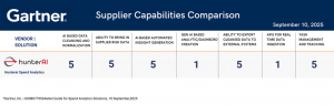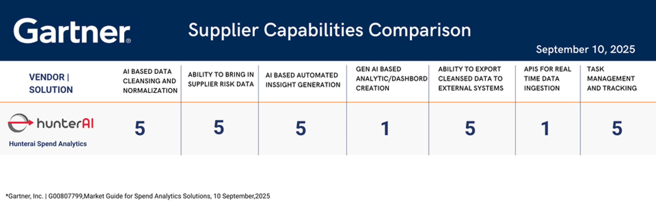 The research outlines market direction and profiles vendors helping procurement and finance teams gain near real-time, actionable insights across disparate data sources. It also provides a table with supplier capabilities comparison, where each capability ranges from 0 being no functionality to 5 being significant support for the capability. In the evaluation, hunterAI was rated as providing significant support across five out of seven supplier capabilities Gartner defines as critical for spend analytics solutions validating the company’s unique approach and rapid momentum in the procurement technology space.