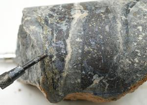 The gold mineralization in THN25-337 and THN25-339 is hosted within Triassic lapilli tuff volcanic, intruded by a Cretaceous quartz diorite and a feldspar porphyry dike of unknown age. Gold is associated with vein assemblages of pyrite-sphalerite-galena as seen in Figure 2. While mineralization is hosted within all three rock types, higher grade favours the contacts between these units. Low grade gold mineralization occurs between these reported intervals.
